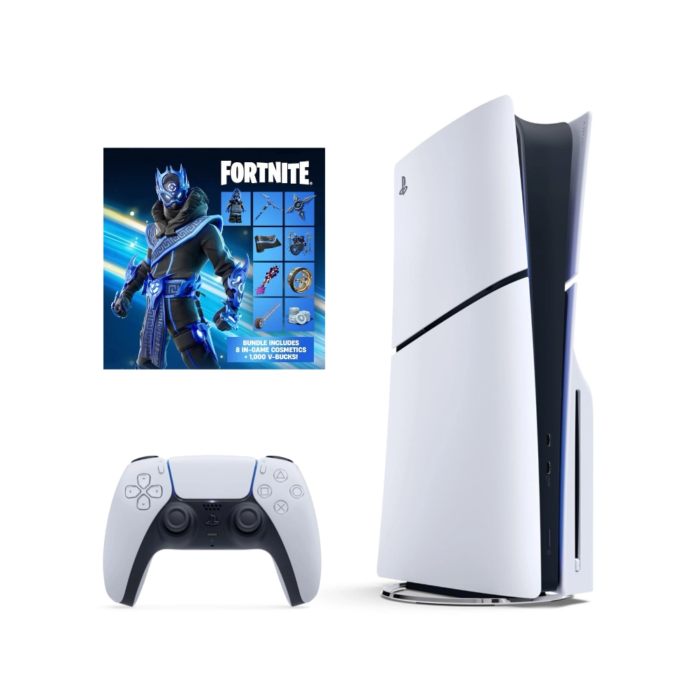 son exclusivos de este bundle y no se pueden comprar habitualmente en la tienda de objetos de Fortnite. La consola permite la conexión de accesorios adicionales vía USB-C y es compatible con el soporte vertical que se vende por separado.